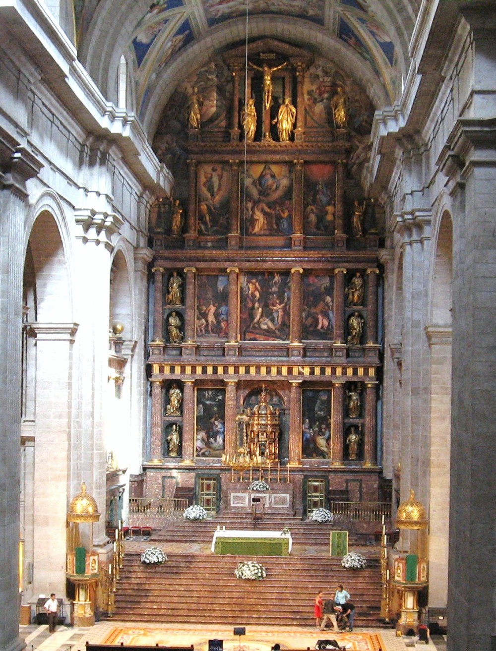 Dentro de la corte, el gran referente fue, durante el primer tercio del siglo XVII, el retablo de El Escorial, donde se concentraban los esfuerzos de Felipe II en dar forma a los contenidos de los postulados trentinos, que abogaban por una claridad didáctica, con escenas más legibles. La arquitectura, diseñada por Herrera, estaba fundamentada en el lenguaje de los órdenes clásicos. Como marco para el desarrollo de los grandes lienzos y de los bronces de Pompeo Leoni. Es conocido el fracaso de la gran tríada veneciana Tiziano, Tintoretto y Veronese que no cumplían las espectativas de claridad y decoro de Trento. Finalmente serán sustituídas por los lienzos de Zúcaro y Tibaldi, que si bien no eran pinturas de gran calidad, cumplían a la perfección su cometido en el retablo.