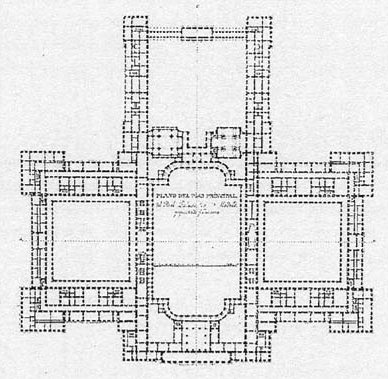 Se ha señalado también que el proceso de proyección de Juvarra es casi siempre el mismo: citas tipológicas y soluciones espaciales que le llevan a diferenciar radicalmente la función compositiva del exterior y del interior del edificio[18]. Así se pueden rastrear perfectamente los posibles ejemplos que toma Juvarra para su concepción del proyecto madrileño.