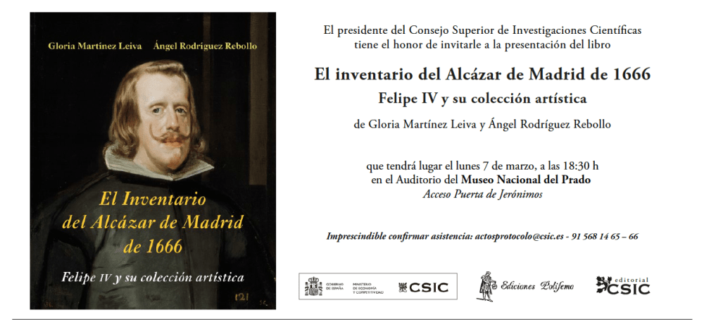 Toda esta reflexión viene a cuento de que este lunes 7 de marzo presentan un magnífico libro dos colegas y amigos: El inventario del Alcázar de Madrid de 1666. Felipe IV y su colección artística de Gloria Martínez Leiva y Ángel Rodríguez Rebollo.
