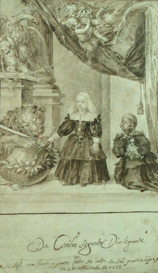 Sebastián de Herrera Barnuevo, Carlos II con un enano, Albun de Fernando VII. Real Biblioteca de Palacio, Madrid.