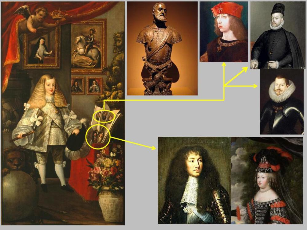 Identificación de los personajes del retrato: Carlos V, Felipe I «el Hermoso», Felipe II, Felipe III, Luis XIV y su esposa María Teresa de Habsburgo.