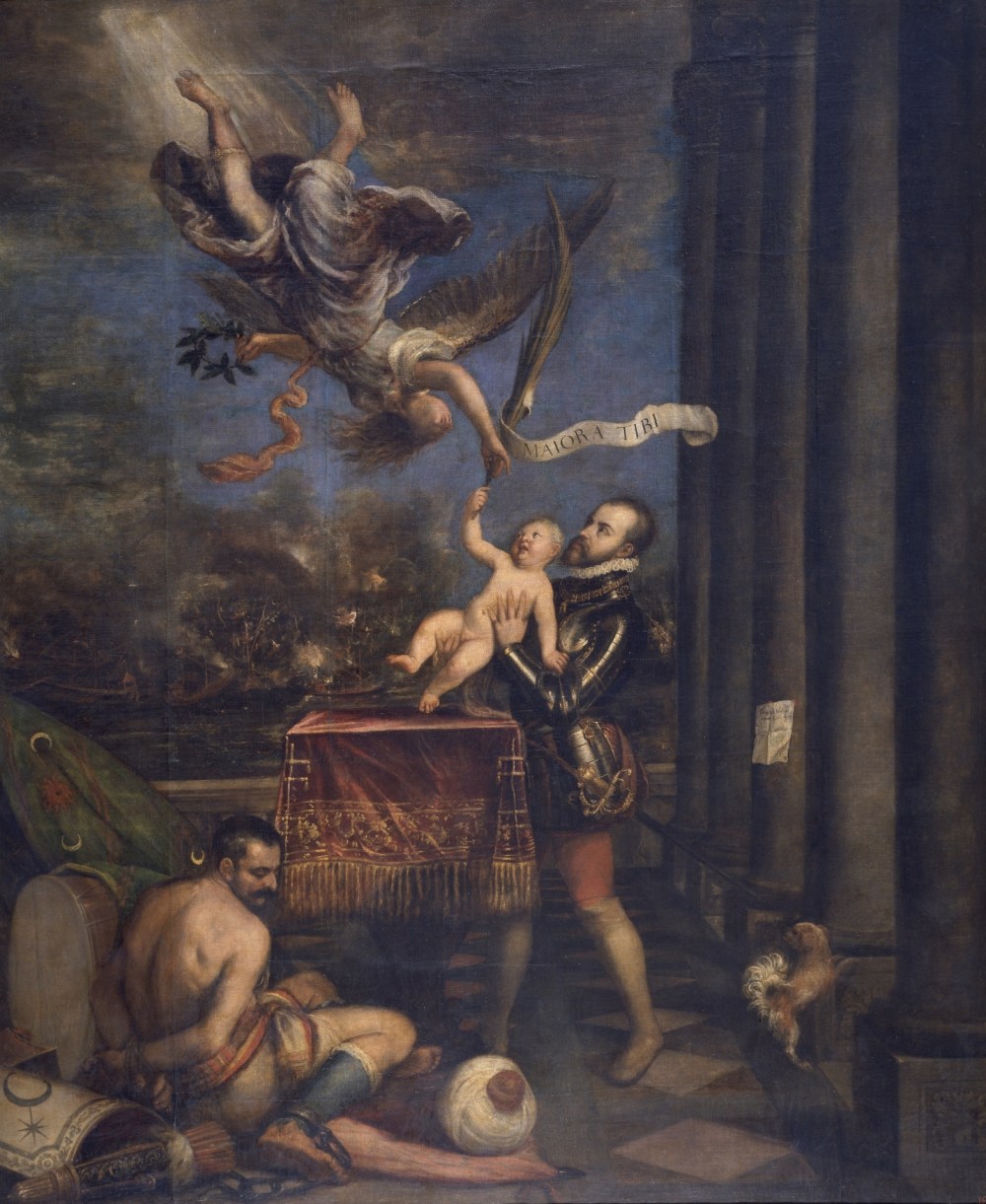 El cuadro como hemos comentado se colgó en las paredes del Salón Nuevo, que más adelante y tras la transformación decorativa proyectada por el propio Velázquez, junto con la adyacente sala del ochavo, se denominará salón de espejos. En las paredes de este espacio aúlico tan representativo de la Monarquía Hispánica, haría pendant con el lienzo de Tiziano Felipe II ofreciendo al cielo al infante D. Fernando (Museo del Prado). Este lienzo había sido recrecido por Vicente Carducho para la ubicación en el salón.