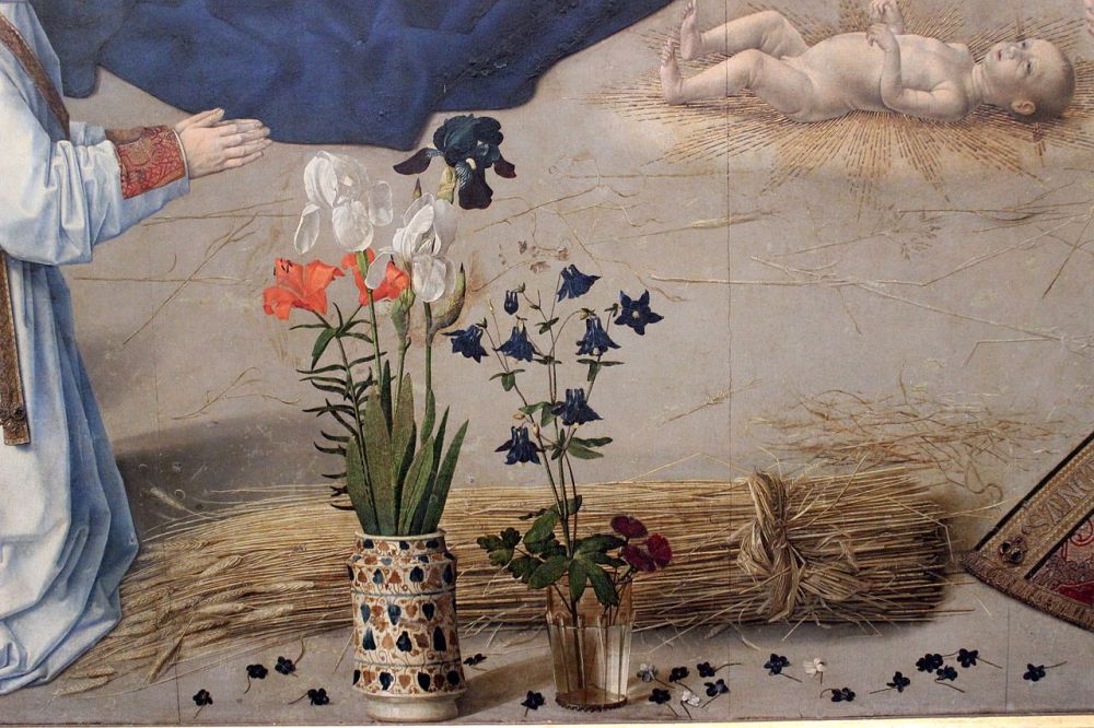 Para complementar toda la iconografía sobre la conexión entre el nacimiento y la muerte de Cristo, el pintor se ha valido de la utilización de las flores. En el primer término se pueden distinguir dos jarrones, el primero, un albarelo de farmacia, contiene una azucena escarlata y tres lirios, dos blancos; el segundo, un vaso de cristal, contiene ramas de aguileña. El significado de las flores no puede ser más claro: la azucena escarlata hace referencia a la sangre de Cristo en la Pasión, así como el lirio blanco que representa la virginidad de María y también las espadas que atraviesan su corazón como Mater Dolorosa, así como las ramas de aguileña. La gavilla de trigo, colocada entre las flores, hace referencia al lugar de nacimiento (Belén significa “Casa de pan”) y a la vez a la Eucaristía y al dogma de la Transubstanciación[3].