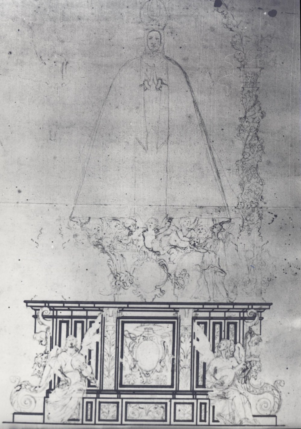 Un dibujo encontrado en el Archivo de la Obra y Fábrica, se ha puesto en relación con la obra de Cano[35]. Se trata de un proyecto esquemático para un retablo, o para la hornacina que debe albergar a la imagen de la Virgen en el frente septentrional de la Capilla de Nuestra Señora del Sagrario, sustituyendo al proyecto de Nicolás de Vergara el Mozo. Pero es lo suficientemente esquemático para no podernos hacer una idea de lo que ideara Cano para un espacio tan suntuoso.
