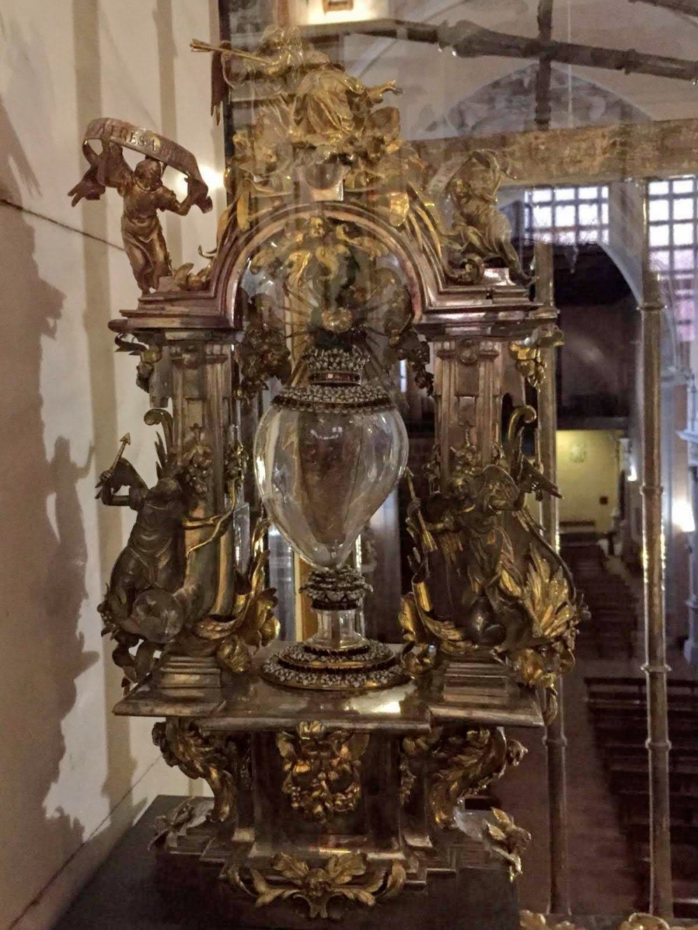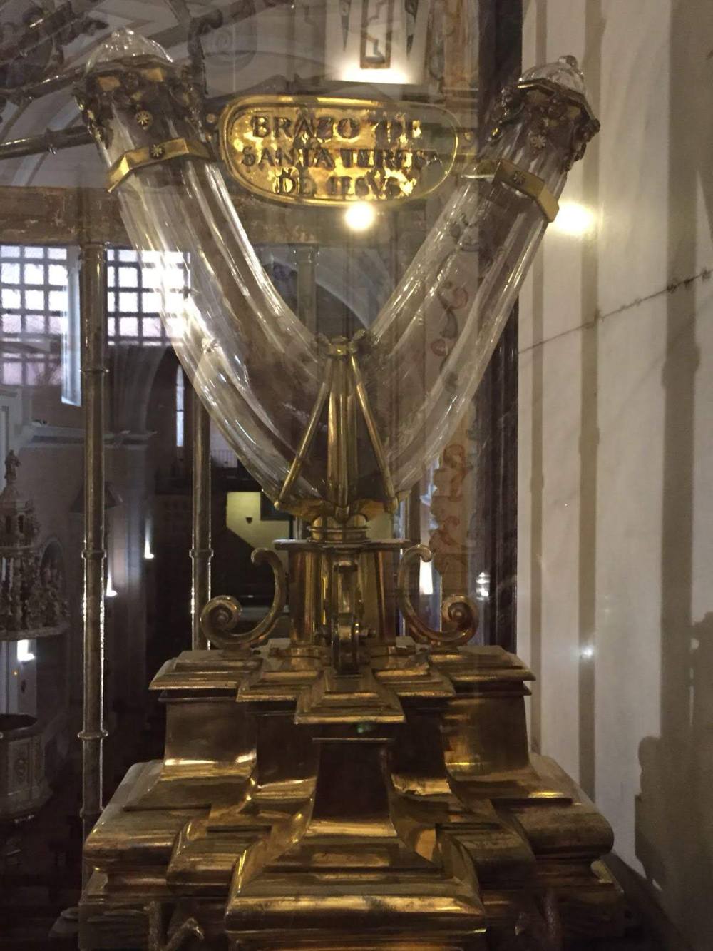 Yo le cobré desde entonces extrañísima afición a esta Santa y sin que las Monjas lo viessen, con las uñas de los dos denos tomé un tantico del tamaño de medio garbanzo, y ahún menos, y envolvílo en un papelico pequeño, y metílo en mis horas, y guardélas, y volviles el Brazo. A mí me quedaron los dos dedos bañados con óleo que sale de él, que me espanté. La Priora, sabiendo que venía desde allí a San Lorenzo, donde estaba el Rey y la Infanta Doña Isabel, me dió un pedazo de la túnica con que enterraron a la Santa, de quadro, en quadro toda empapada en óleo de su cuerpo, guarnecido este pañito de perlas menudas alrededor , para que lo diesse a la dicha Señora Infanto: y a mí me dio otro poquito de lo mesmo, muy chiquito”.