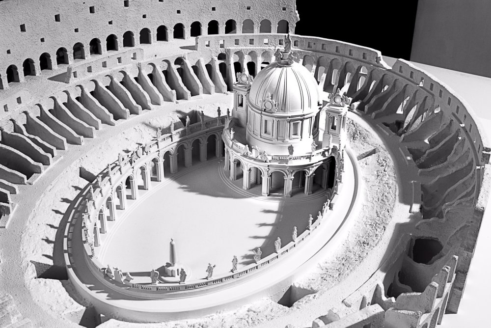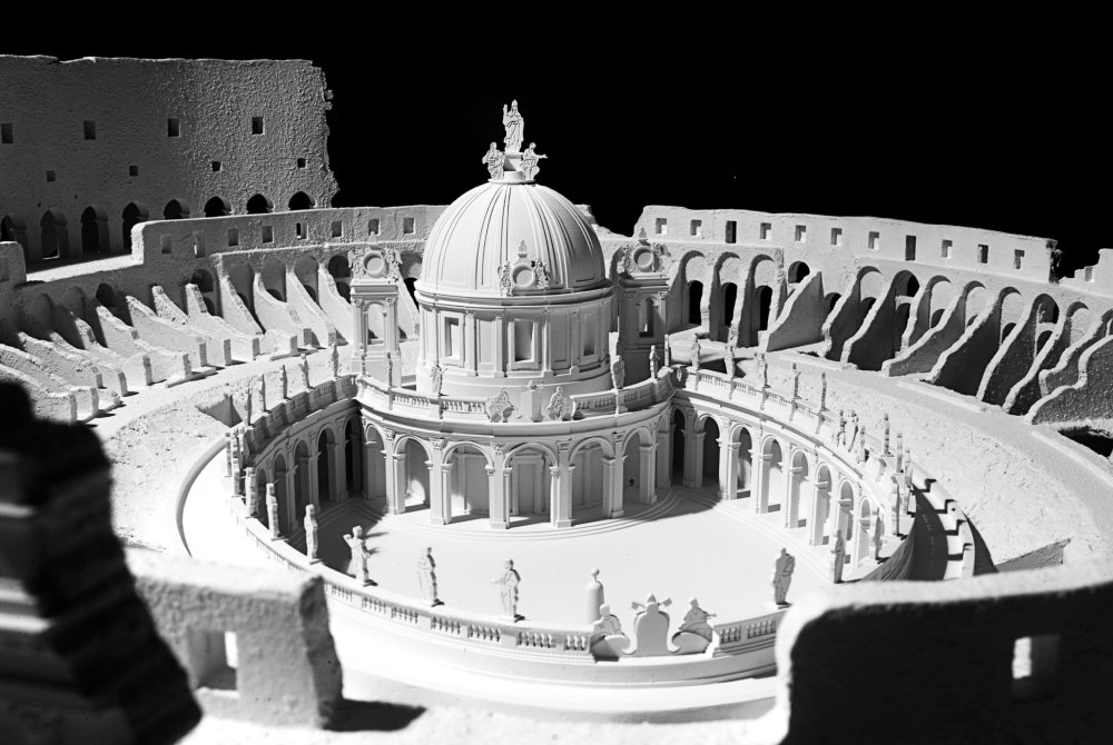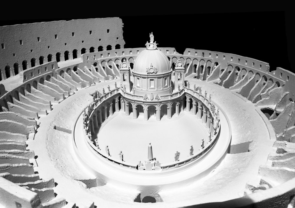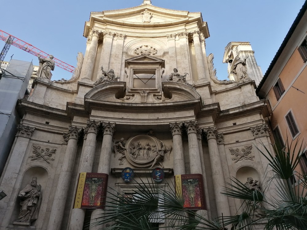 El proyecto de Fontana concibe un gran bloque que acoge todas las funciones del edificio, incluido en su interior la torre de la casa solariega, centrado todo por un templo de planta circular. Todo el proyecto se mandó desde Roma, pero la ejecución fue a cargo de maestros locales y las obras demoraron más de lo esperado. El diseño de Fontana hacía referencia a ejemplos romanos del momento, por ejemplo, el tambor de la basílica está inspirado en el de Santa María de’Miracoli y la fachada está inspirada en el proyecto no realizado de Rainaldi para Santa María in Campitelli o el proyecto de Fontana para construir una iglesia en el Coliseo de Roma.