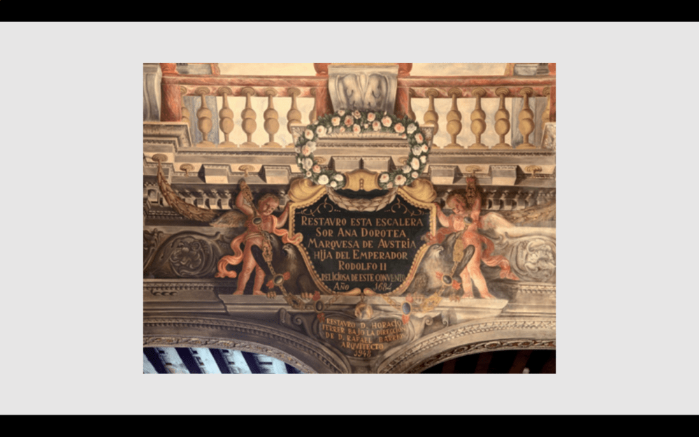 La marquesa de Austria tuvo a su disposición una importante suma de dinero, procedente de la herencia de su padre, con la que no sólo sufragará la construcción del retablo que nos ocupa, sino que además también servirá para dar conclusión a la espectacular pintura de quadratura de la escalera del convento, como reza en la inscripción[12].