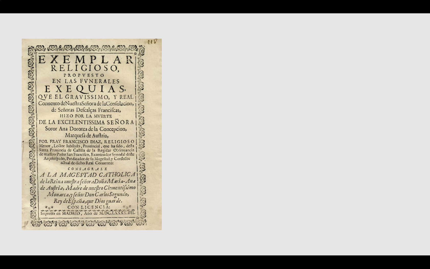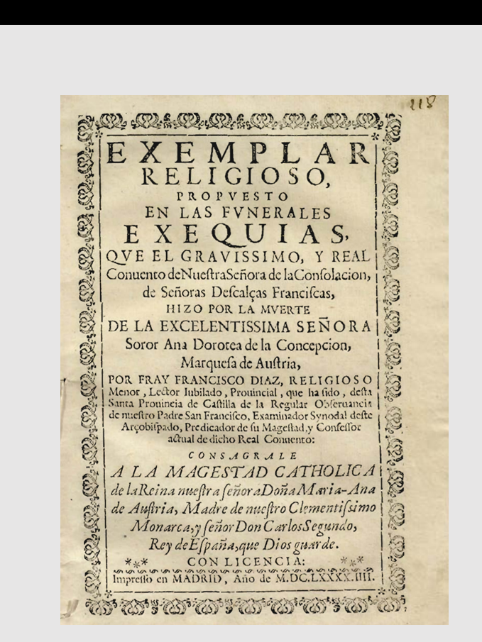 Díaz, Francisco, Exemplar religioso, propuesto en las funerales exequias, que el gravissimo, y real convento de Nuestra Señora de la Consolación, de Señoras, Deslcalças Franciscas, hizo por la muerte de la Excelentissima señora Soror Ana Dorotea de la Concepción, Marquesa de Austria…, Madrid, 1694