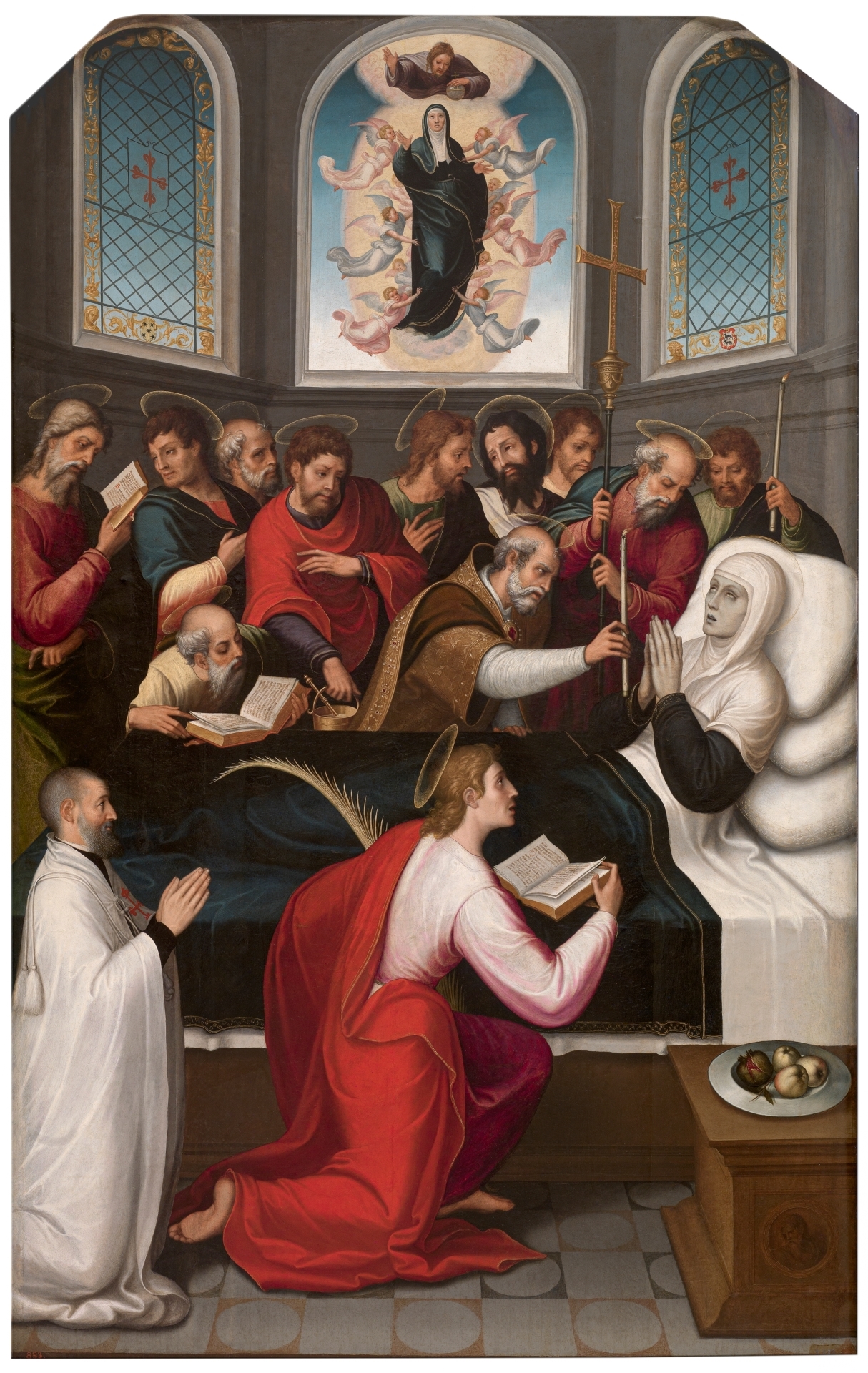 Juan Correa de Vivar. Tránsito y Asunción de la Virgen. 1546-50. Museo del Prado. En este caso San Juan (de rojo y blanco en primer término) vuelve a ser el portador de la palma.