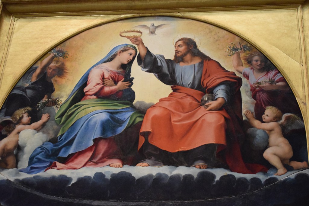 Tras la Ascensión, inmeditamente después, se produce la coronación de la Virgen, o lo que es lo mismo, la confimación de su posición preeminente en el corte celestial: