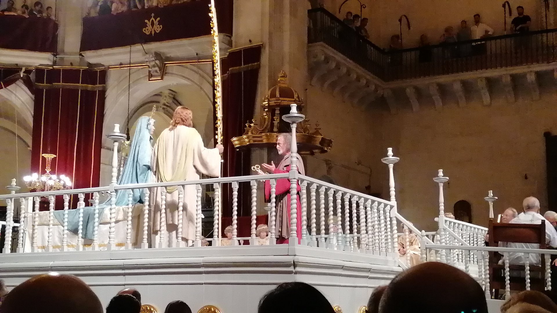 San juan, con la palma en la mano y San Pedro, con las llaves, llegan a despedirse de María ante su próxima muerte. Vespra (1 acto) del Misteri d’Elx. Foto: @cipripedia.