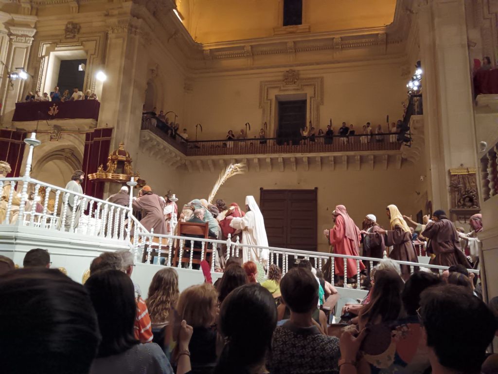 Los apóstoles se enfrentan a las autoridades hebreas que planean impedir el entierro del cuerpo de María. Festa (acto 2) del Misteri d’Elx. Foto: @cipripedia tomada el 12/08/2024.
