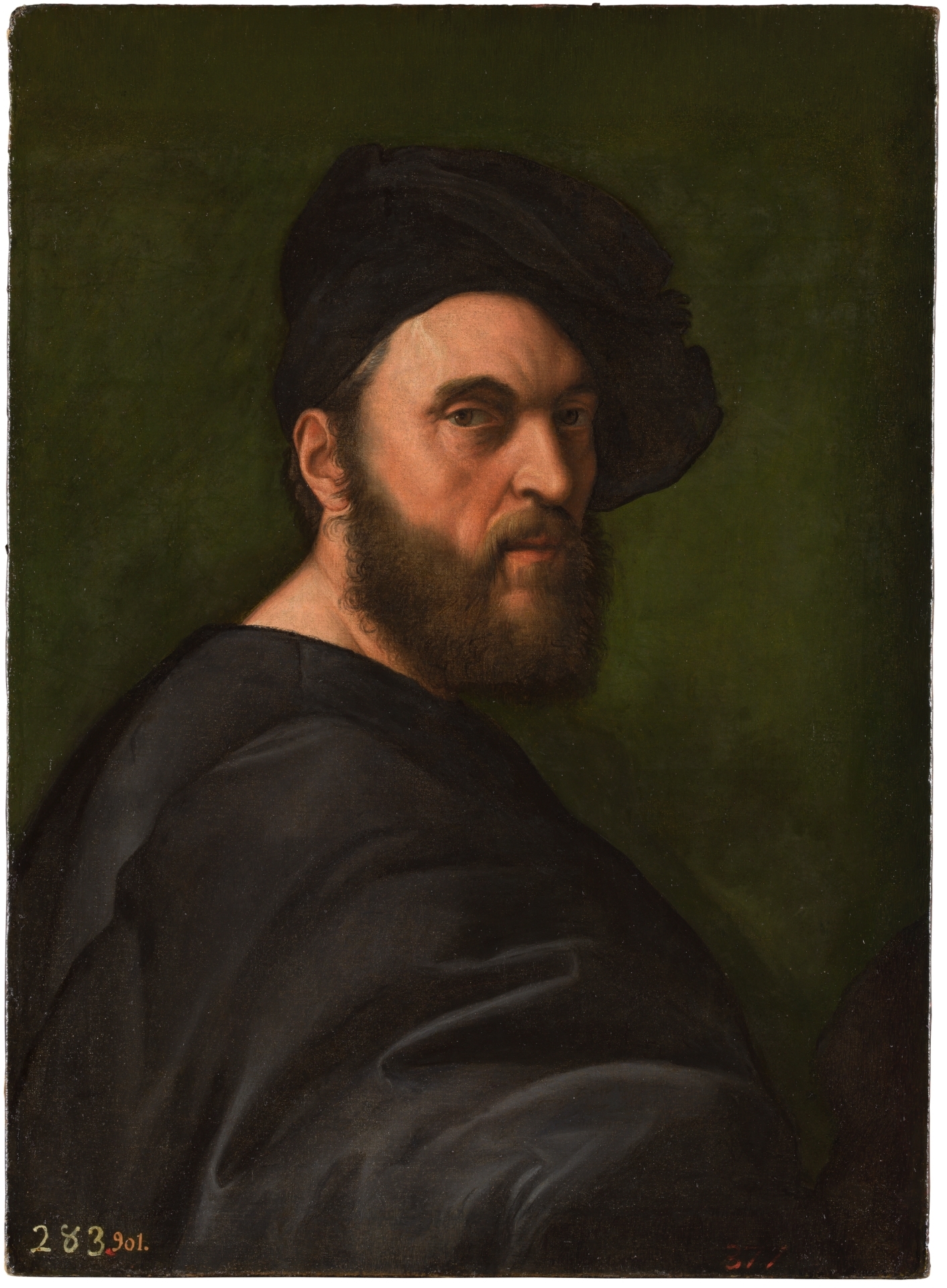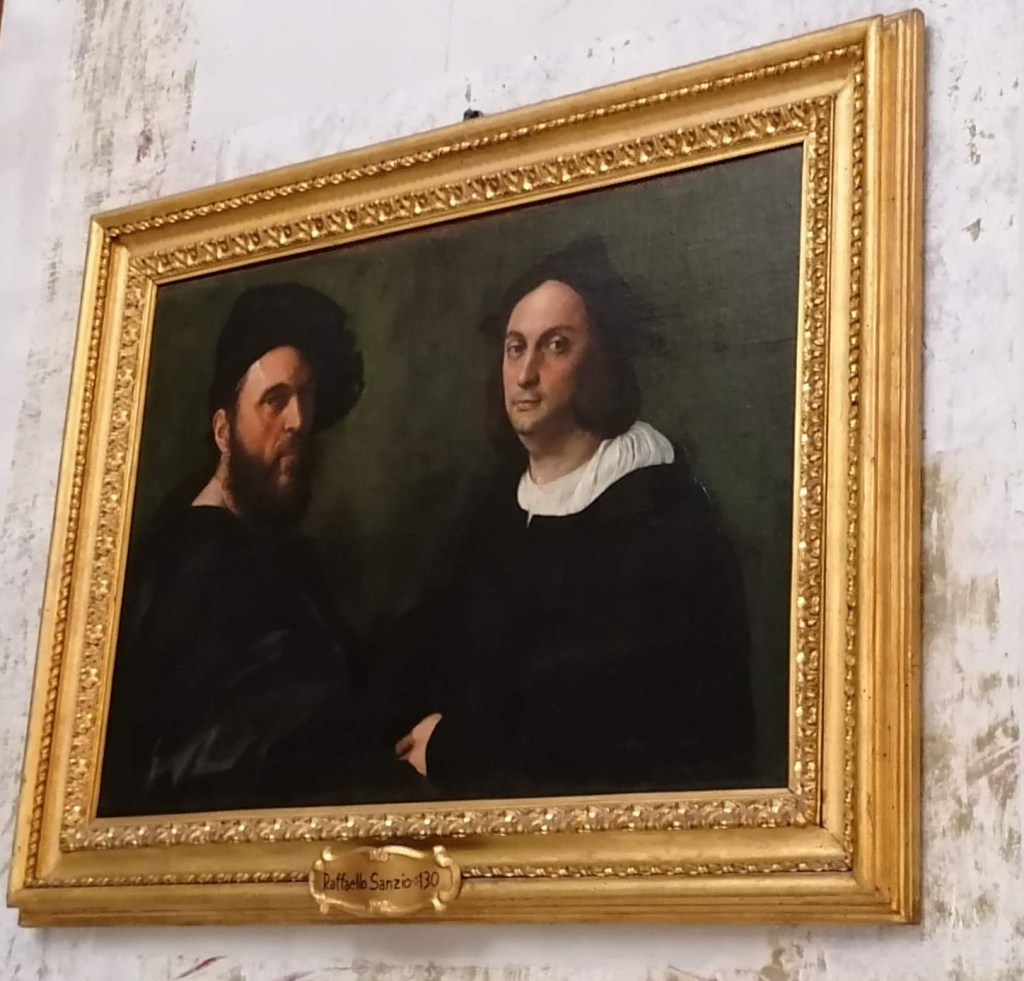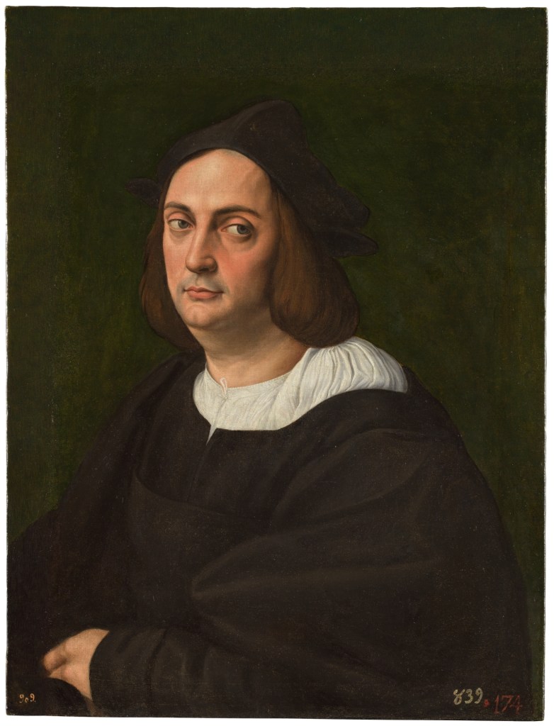 Los lienzos, inicialmente unidos, copiarían el doble retrato pintado por Rafael en 1516 (Roma, Galleria Doria Pamphilj). Su autor, seguramente veneciano, calcó el original para hacer un duplicado exacto, imitando también su factura pictórica. La obra debió dividirse apenas llegada a España, pues en 1686 las efigies ya figuran separadas en la Galería del Mediodía del Alcázar de Madrid.
