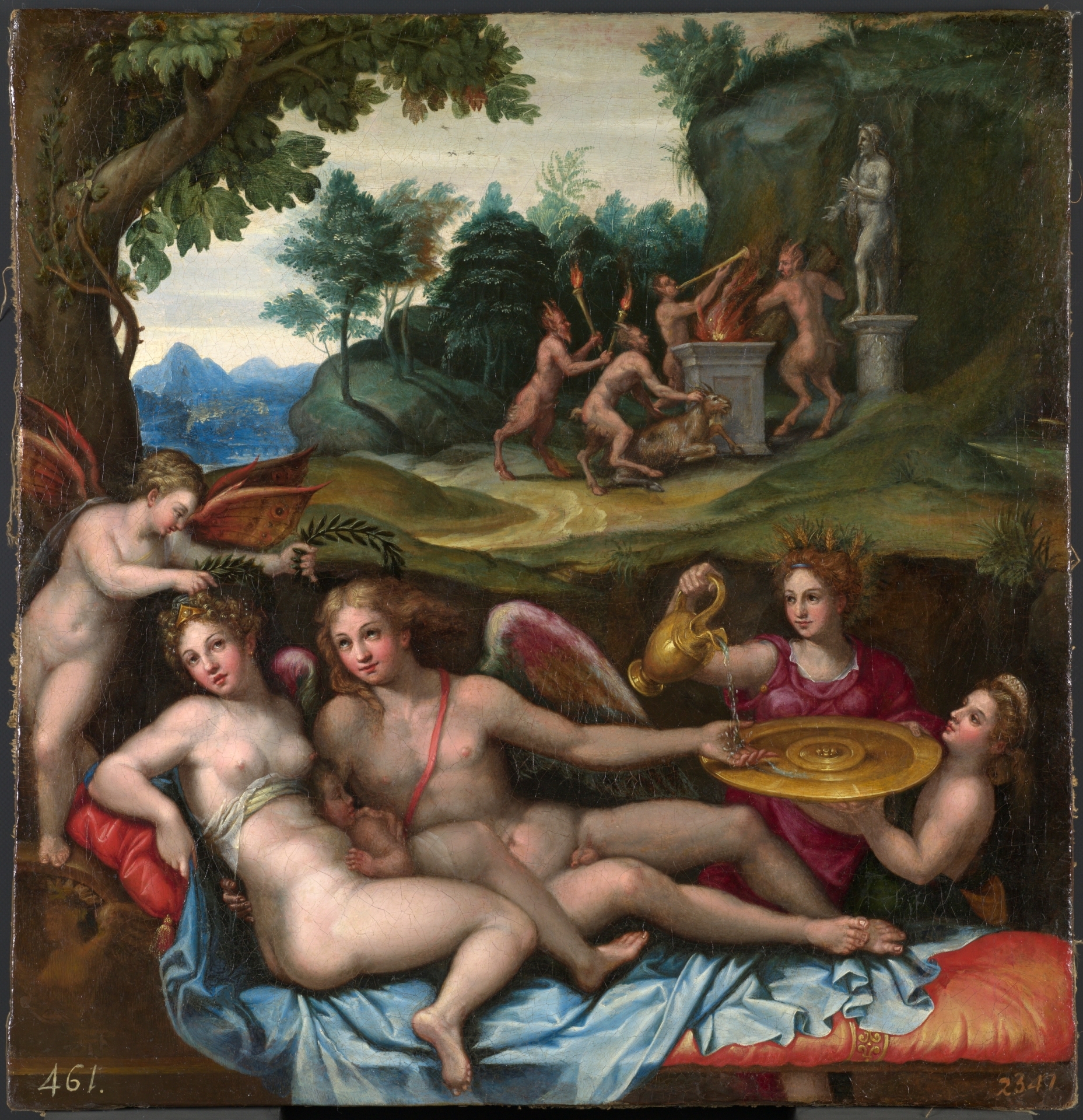 La obra interpreta a escala reducida una escena de la fábula de Psique y Cupido pintada por Giulio Romano en el Palazzo Te de Mantua en 1526-28. Las diferencias con el original se aprecian sobre todo en la relación entre el fondo y el primer término y en el color. Estos cambios ponen de manifiesto que la copia se realizó a partir de un grabado —debido a Giorgio Ghisi— y no del fresco original.