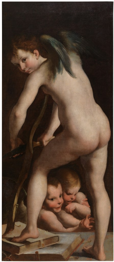 Al ciclo de los “Amores de Júpiter” de Correggio se le añadió tiempo después una quinta pintura debida a Parmigianino, con un Cupido de mirada seductora tallando su arco. Dicha obra perteneció a Antonio Pérez, secretario de Felipe II, y pasó tras su caída en desgracia a la Colección Real. Felipe III se la regaló junto con otras de la serie (también comentadas en esta sala) al emperador Rodolfo II, y mandó realizar esta copia para guardar memoria del original.
