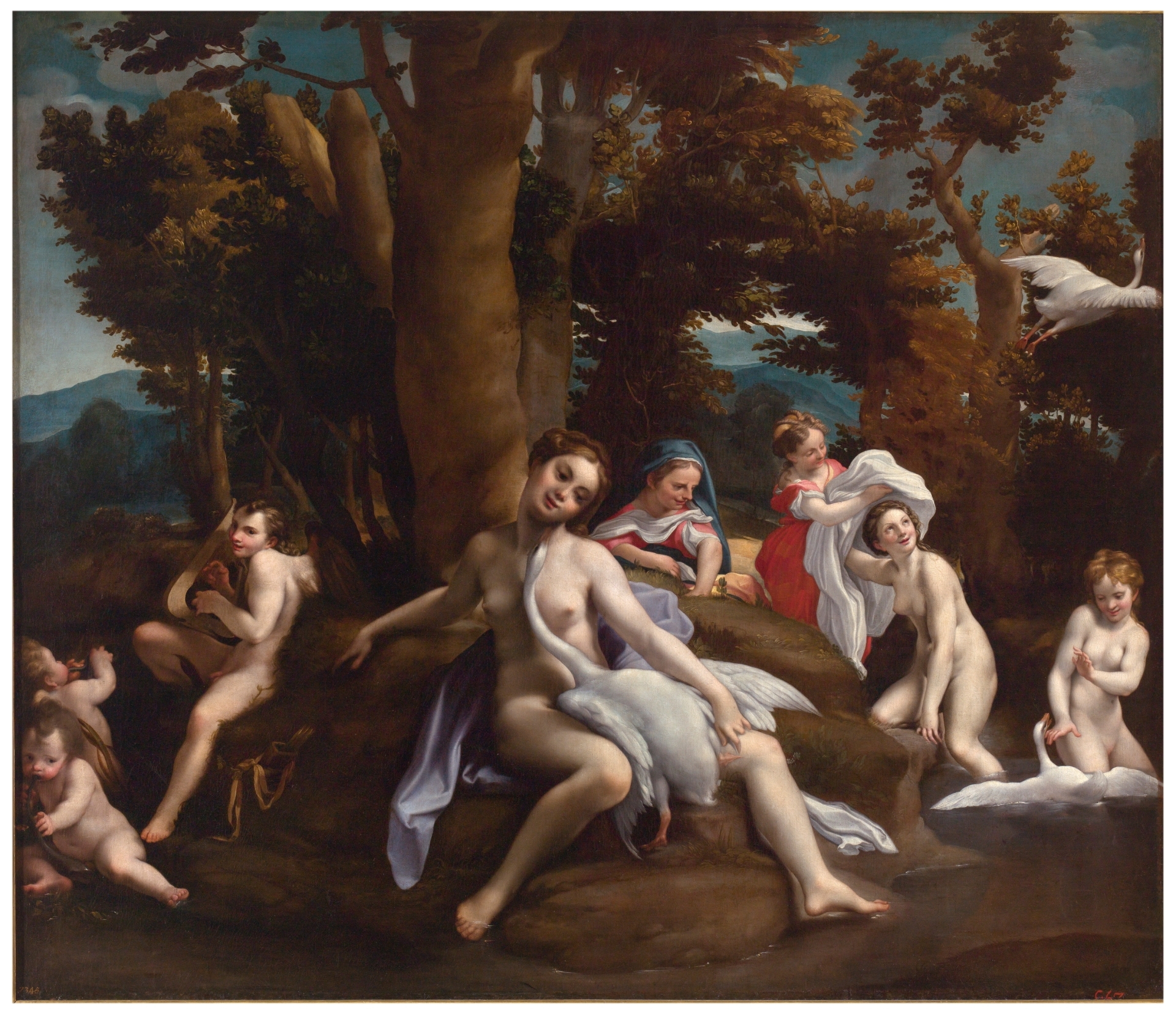 Los originales de Correggio que copian estas obras formaron parte de un ciclo sobre los amores de Júpiter para el duque de Mantua que tuvo una gran fama e influencia. Dos de ellos estuvieron en la Colección Real española hasta que en 1603 Felipe III se los regaló a su primo el emperador Rodolfo II. El propio rey los mandó copiar para guardar su memoria. La copia de la Fábula de Leda ha cobrado con el tiempo un valor especial, al documentar la posición de la cabeza de la princesa etolia en el original de Correggio, antes de la agresión que sufrió en el siglo XVIII, motivada por su supuesta lascivia.