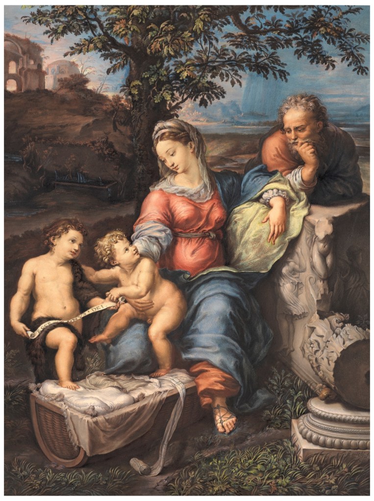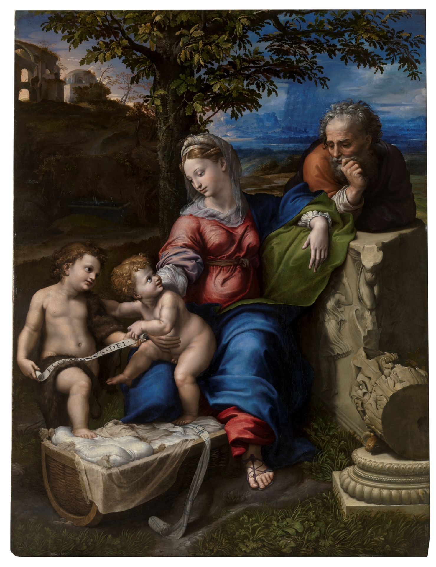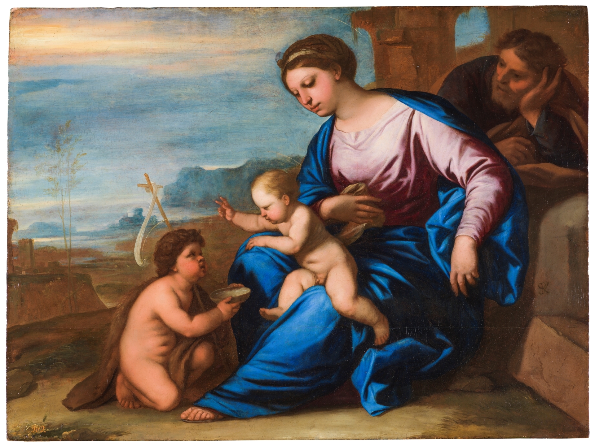 A lo largo de su carrera, pero especialmente en su juventud, Luca Giordano sorprendió a sus contemporáneos por su extraordinaria capacidad para imitar el estilo de varios grandes maestros del pasado. Aquí emula el de Rafael al reinterpretar con libertad la composición de su Virgen del Amor Divino. Como ponen de manifiesto las iniciales «RSV» (Rafael Sanzio de Urbino) en la zona inferior derecha, en la obra de Giordano hay una cierta intención falsaria.