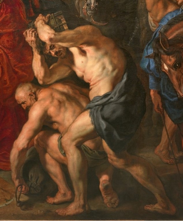 Una de las cosas que más nos puede llamar la atención es ese grupo de dos hombres desnudos, que en realidad es la demostración de Rubens de su profunda formación italiana: anatomías de Miguel Ángel e iluminación y pies sucios del otro Miguel Ángel, el Caravaggio.