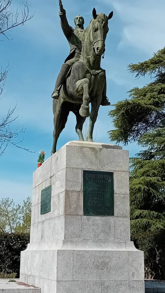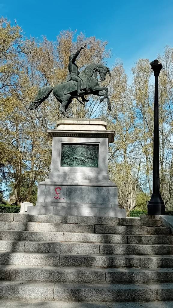 Esta semana, escribo esto el día 11 de abril de 2025, acudí al parque del Oeste para visitar estos retratos de libertadores hispanoamericanos y me encontré con sorpresa y cierto desagrado como la escultura de San Martín, la réplica del bronce de Daumas, hecha en Argentina por Agustín de la Herrán Matorras y Luis Perlotti, había sido vandalizada con una pintada que reza «libertraidor» y el símbolo de la libra esterlina británica, he de suponer que el autor o autores de la vandalización quieren reflejar el peso que tuvo los intereses británicos en promover la independencia de las colonias españolas.