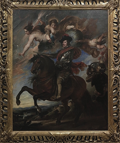 El frontispicio de la edición de Amberes de 1655 de este libro está adornado con los retratos ecuestres, hechos en estampa, de Felipe IV y de su hermano el cardenal Infante don Fernando, entonces gobernador de los Países Bajos. Es decir, durante todo el Antiguo Régimen, los retratos ecuestres tienen mucho de simbología política, de capacidad de mando, se maneja las riendas del poder al igual que se manejan las del caballo. Pero ¿cuál es el origen de esta tipología de retratos?