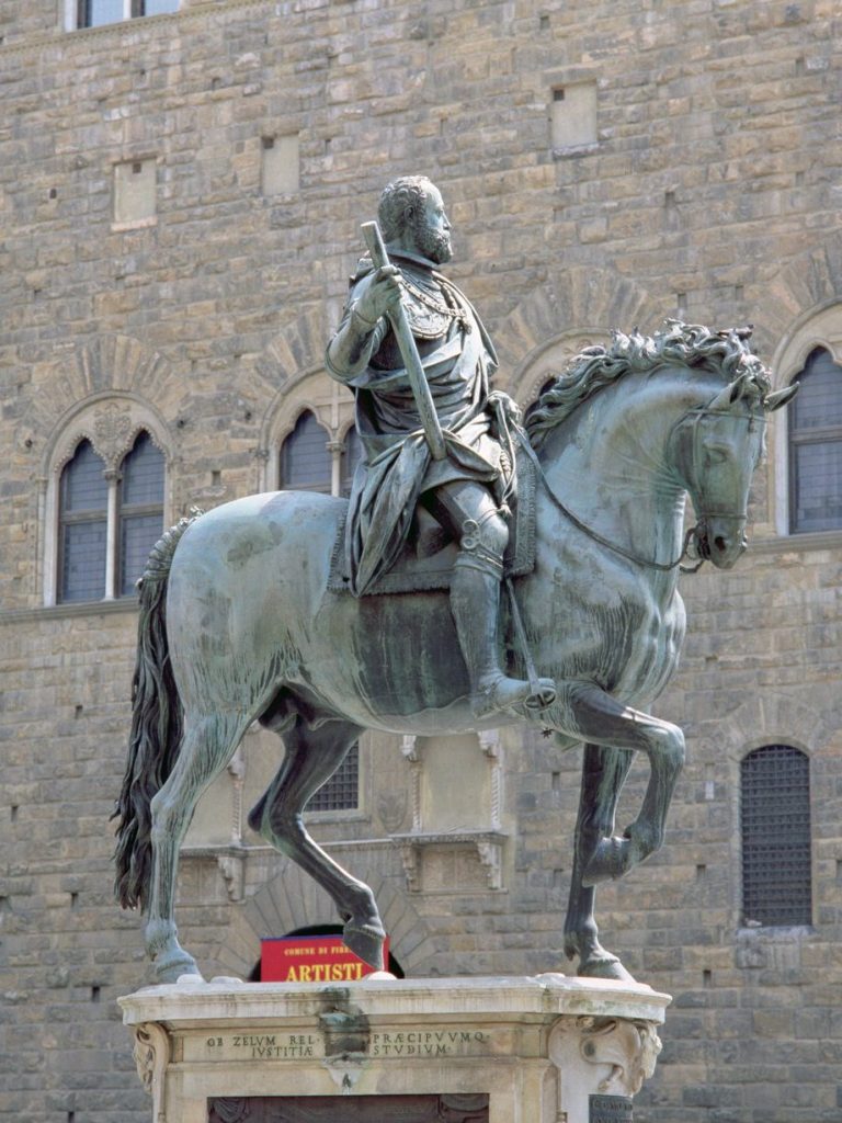 El escultor realizará nada menos que cuatro esculturas ecuestres. La primera es un encargo del duque Fernado I en 1587 para honrar a su padre Cosme I, la escultura de gran tamaño, se concluyó en 1594 y se situó en la piazza della Signoria. Para el caballo se inspiró en una cabeza de caballo etrusco que estaba en las colecciones de los Médici. El conjunto con el caballo en acción de avanzar tiene mucha prestancia, pero no llega a las cotas de intensidad que había logrado Verrocchio con su escultura. Pese a ello, la actitud del caballo es naturalista y Cosme I aparece con una dignidad especial, remarcada por el manto colocado sobre la armadura que genera una línea que enmarca la figura del gran duque y aumenta su prestancia, a la vez que recuerda a los ejemplos clásicos.