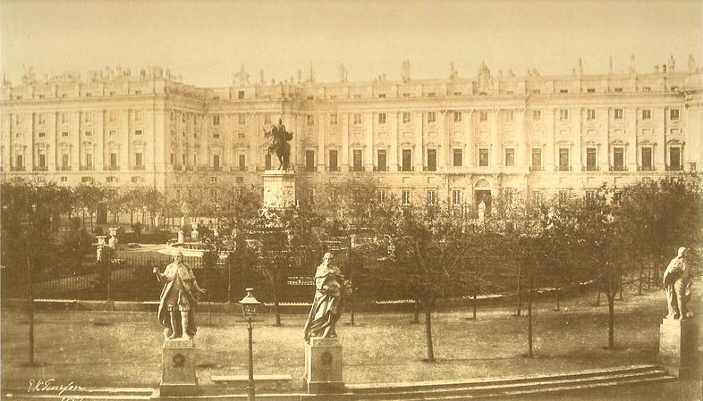 La plaza de Oriente se va a ajardinar con un proyecto del arquitecto Narciso Pascual y Colomer, que proyecta una zona elíptica central, limitada por una verja de hierro y un amplio paseo que la rodeaba. En el centro se colocó la estatua ecuestre de Felipe IV de Pietro Tacca de la que ya hemos hablado y para eso se construyó un monumental pedestal que a su vez también es fuente y que es obra de los escultores de cámara Francisco Elías Vallejo y José Tomás, en la base rectangular del pedestal sitúan en lo lados largos dos relieves con temas alusivos a Felipe IV como protector de las Artes y otorgando la cruz de Santiago a Velázquez. En los lados cortos dos figuras clásicas de ríos de los que mana agua para las fuentes de la parte inferior del pedestal son las personificaciones de los ríos Manzanares y Jarama. En los ángulos del prisma que forma el pedestal, hay cuatro leones de bronce. El pedestal sobrepasa en gran medida la forma tradicional de elevar una escultura ecuestre de este tipo, y su altura, además, dificulta la visión de la escultura de Tacca, pero hay que reconocer que todo se hizo para intentar dar más relumbre a una plaza de dimensiones descomunales.
